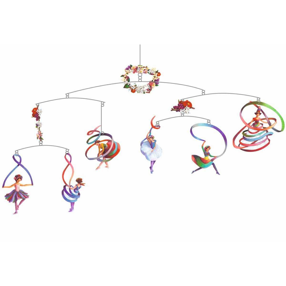 Decoratie mobila Dansul balerinelor Decorație mobilă, ușoară si poetică, cu dansatoare în spațiu. Un echilibru subtil în mișcare, între vis și realitate. Conține piese de sprijin (sârma întărită), formele decorative, adeziv. În interiorul cutiei se află schema de asamblare și montare (în imagini). Dimensiunea decoraţiei asamblate: 60 x 54 cm. Confecționata din hărtie FSC cu vopsele non toxice conform reglementărilor EN71&ASTM. AVERTISMENT! Acest produs este un obiect de decor. Se recomandaă poziționarea acestuia la o distanță de siguranță, in așa fel incât să nu fie la indemâna copilului. Producător: Djeco, Franța.