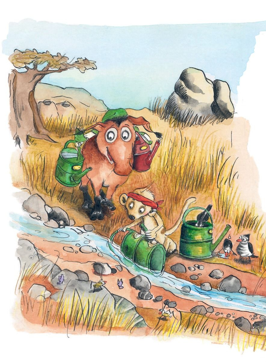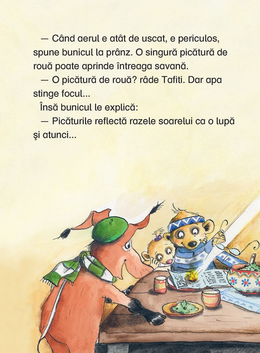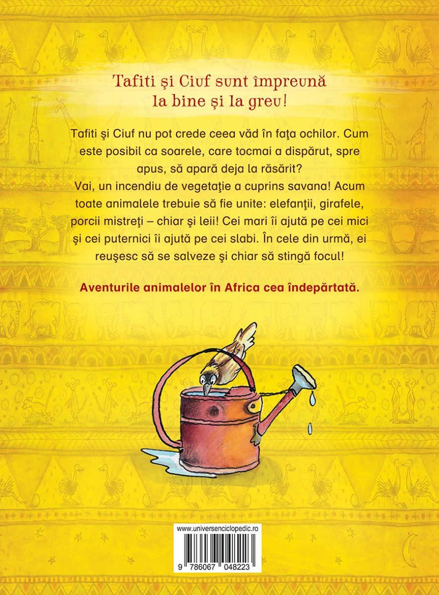 Tafiti şi Ciuf nu pot crede ceea văd în faţa ochilor. Cum este posibil ca soarele, care tocmai a dispărut, spre apus, să apară deja la răsărit? Vai, un incendiu de vegetaţie a cuprins savana! Acum toate animalele trebuie să fie unite: elefanţii, girafele, porcii mistreţi – chiar şi leii! Cei mari îi ajută pe cei mici şi cei puternici îi ajută pe cei slabi. În cele din urmă, ei reuşesc să se salveze şi chiar să stingă focul!
