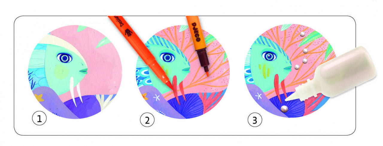 Atelier creativ de desenat Sub apa Set creativ cu planșe pentru desen. Fundul mării este colorat cu carioci pensulă și apoi irizat cu margele de vopsea sidefată. Conține: 4 planșe preilustrate (15x21 cm), 5 carioci pensulă cu două capete, unul tip pensulă si celălalt subțire, recipient cu vopsea perlată cu volum pentru decorul final, broșură color cu instrucțiuni pas cu pas. Vârsta recomandată: 7 - 13 ani. Confecționat din materiale non-toxice, cu culori non-toxice certificate FSC®. AVERTISMENT! Contraindicat copiilor sub 3 ani. A se utiliza sub directa supraveghere a unei persoane adulte. Producător: Djeco, Franţa.