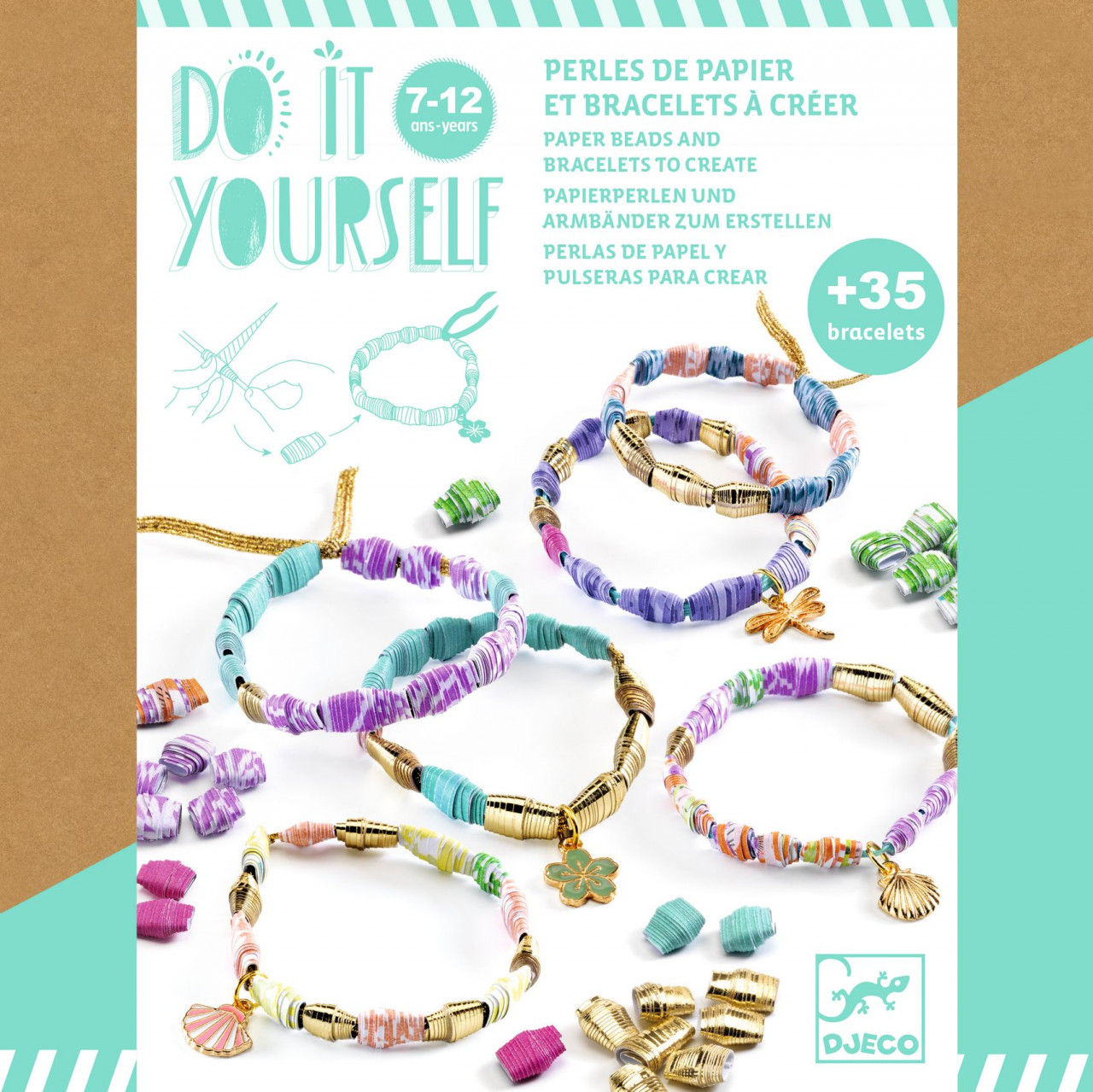 Atelier de confecționat brățări cu mărgele din hârtie Confecționează brățări făcute în întregime de tine, chiar și mărgelele pe care le aranjezi după cum îți place. Un kit de artă și meșteșuguri pentru a crea tot felul de brățări colorate din margele de hârtie realizate manual. Copiii taie foile cu model în fâșii, le rulează și le lipesc. Aceste mărgele sunt apoi gata pentru a fi înșirate pe firul elastic pentru a crea bijuterii frumoase. Puteți să le decorați cu pandantivele furnizate. Peste 400 de mărgele de realizat – suficient pentru zeci de brățări. Include un sortiment de pandantive aurii colorate, pentru a face bijuteriile și mai frumoase. O activitate de care să te bucuri singur sau cu alții. Instrucțiunile oferă sfaturi creative pas cu pas. Conținut: 20 de coli de hârtie cu model și auriu (19 x 19 cm), 6 bețe de lemn, șnur elastic auriu (4,2 m), șnur elastic albastru (4,2 m), 12 pandantive asortate (de exemplu, fluturi, libelule, scoici, flori ), baton de lipici, broșură color cu instrucțiuni pas cu pas. Vârsta recomandată: 7 - 12 ani. Confecționat din hârtie și carton certificat FSC®, lemn, textil. AVERTISMENT: Contraindicat copiilor sub 3 ani. Conține părți mici ce pot fi înghițite. A se utiliza sub stricta supraveghere a unei persoane adulte. Producător: Djeco, Franța