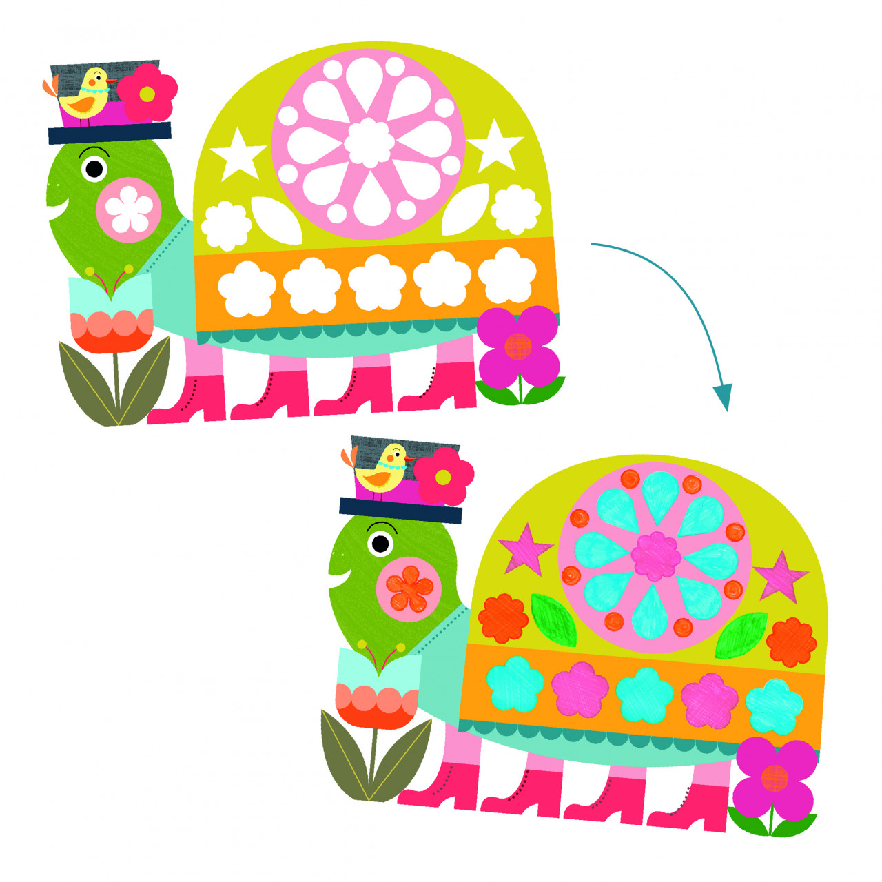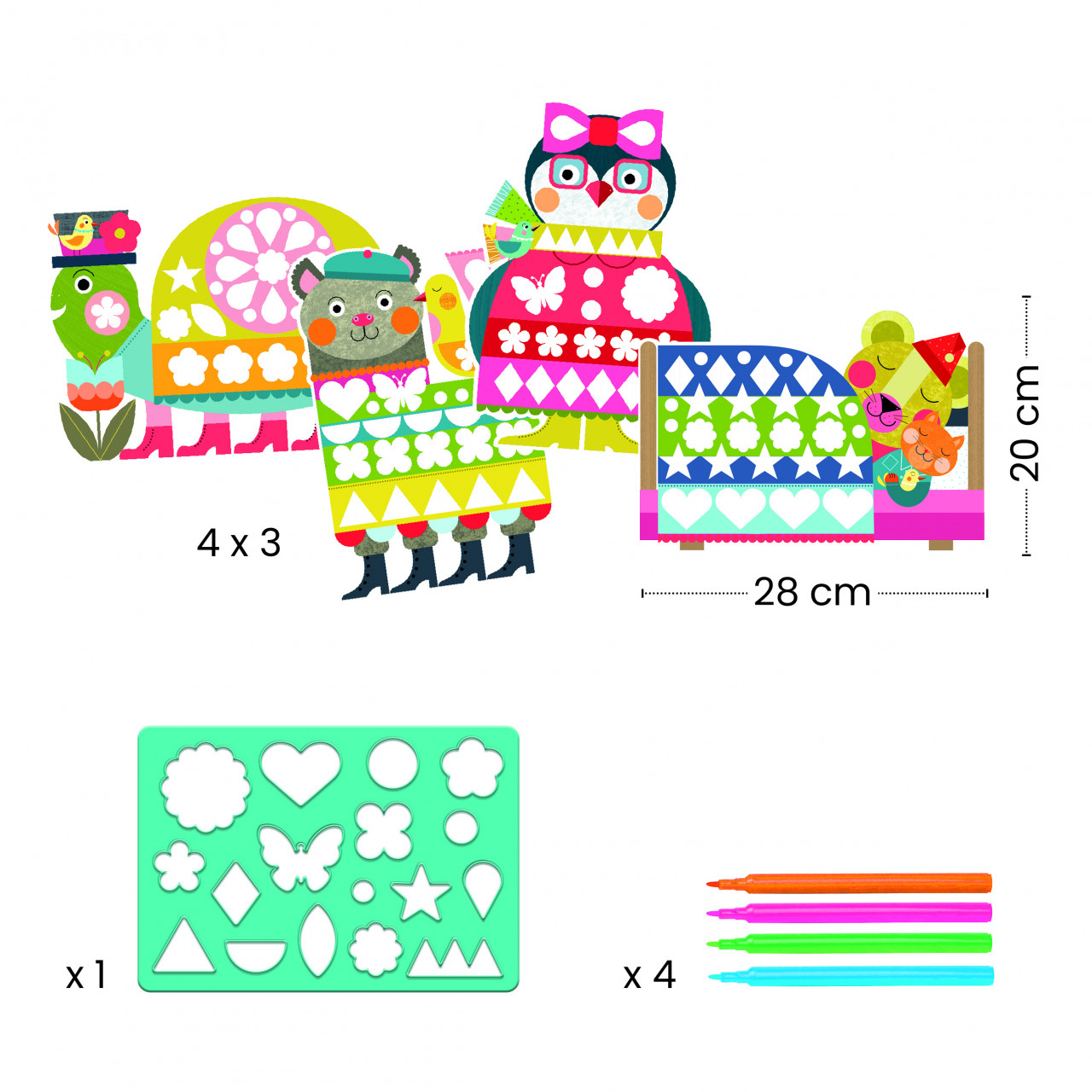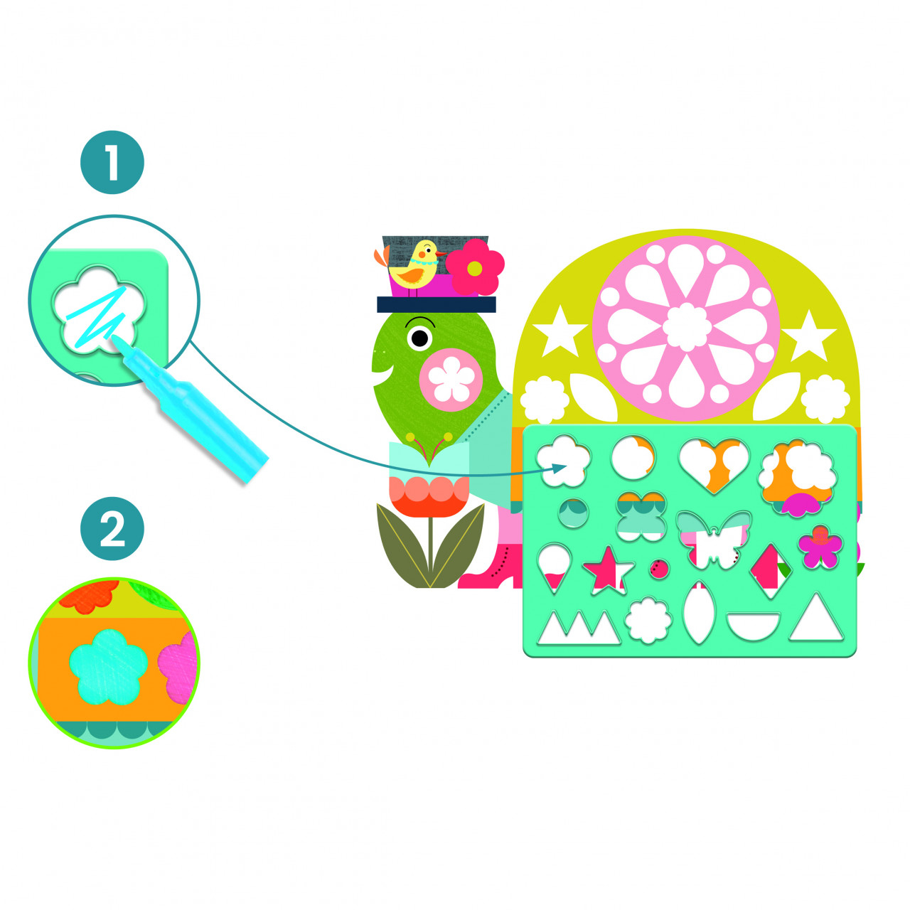 Joc de desenat cu sablon Un set de colorat pentru a decora animale folosind șablon. Alegeți un animal și plasați șablonul astfel încât forma găurii să se potrivească cu cea de pe hârtie. Apoi, colorați în interiorul găurii pentru o formă perfect acoperită. După ce toate formele au fost colorate, va apărea un animal frumos și colorat. O nouă abordare a șablonului. Trebuie să potrivești forma de pe șablon cu cea de pe hârtie. Dezvoltă recunoașterea formelor și conștientizarea dimensiunilor Conținut: 8 foi ilustrate, șablon translucid, 4 carioci cu vârf fin, broșură cu instrucțiuni pas cu pas. Vârsta recomandată: 3 - 6 ani. Fabricat din hârtie și carton certificate FSC®. Conform reglementărilor EN71&ASTM. AVERTISMENT: Contraindicat copiilor sub 3 ani. Se recomandă supravegherea copilului de către un adult în timpul jocului. Citiți cu atenție eticheta produsului înainte de a înmâna jucăria copilului. Producător: Djeco, Franța