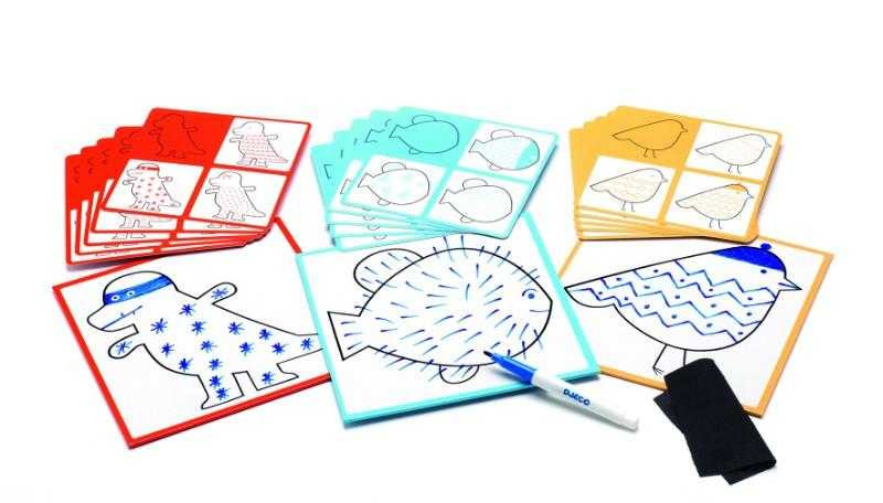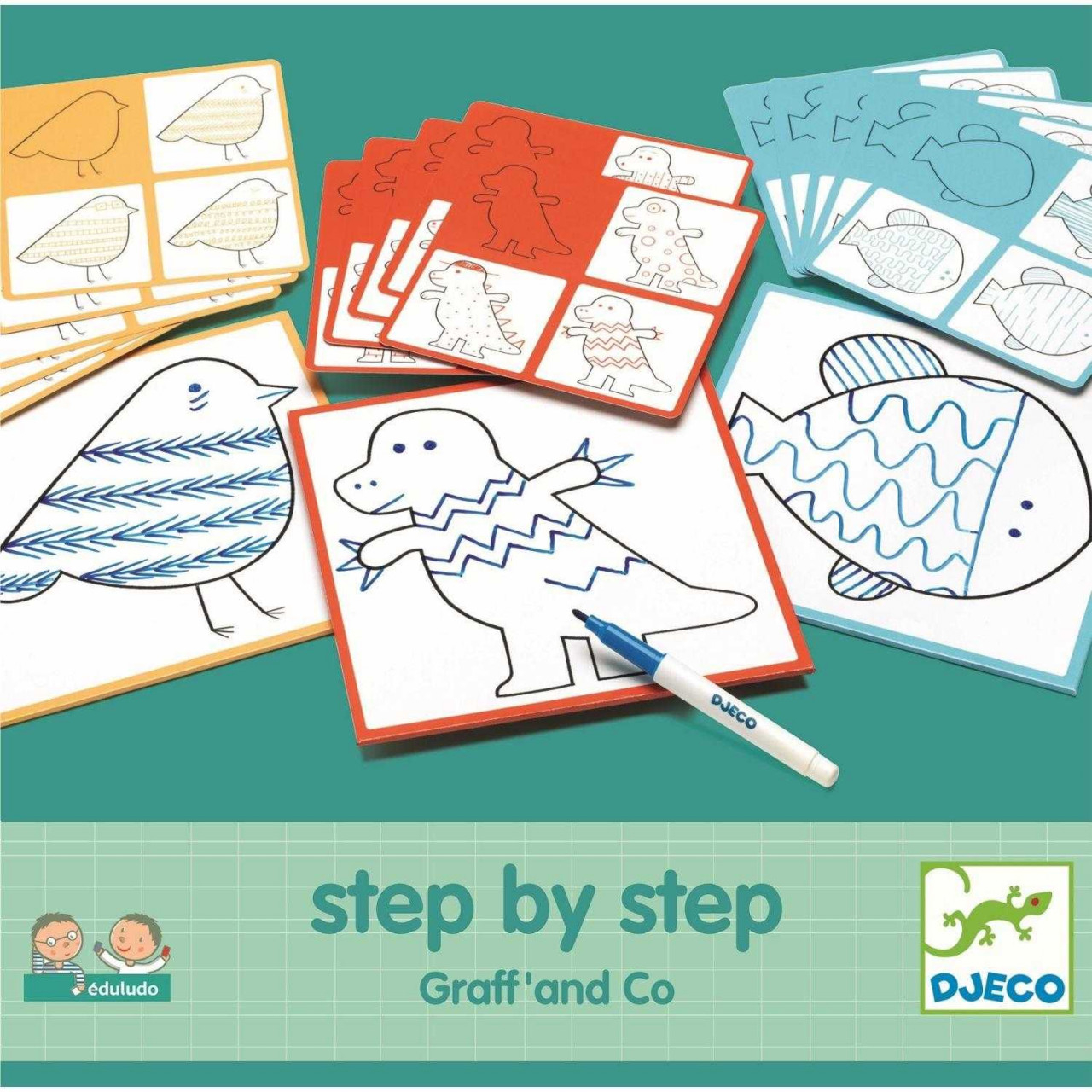 Deseneaza pas cu pas Grafic Creați desene fabuloase decorând dinozaurul, peștele și pasărea. O introducere amuzantă în desen. Urmați cardurile model pentru un ghid pas cu pas pentru desen. Încurajează copiii să exploreze stilurile de desen prin decorarea foilor imprimate cu modele repetitive. Ștergeți tabla albă și continuați să exersați! Conținut: 3 table albe, marker, cârpă, 30 de modele (15 cartonașe cu două fețe). Vârsta recomandată: +3 ani. Confecționate din carton și plastic. Conform EN71 & ASTM. AVERTISMENT: Contraindicat copiilor mai mici de 3 ani, conține piese mici. A se folosi sub stricta supraveghere a unei persoane adulte. Producător: D jeco, F ranța
