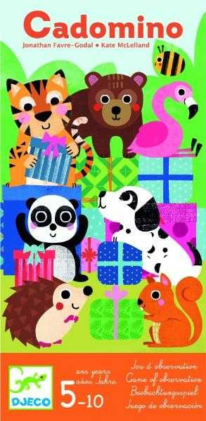 Cadomino joc de societate Un joc de observație și viteză. Aceste animale șmechere ascund cadouri. Cine le va găsi cel mai repede? Pentru fiecare carte provocare întoarsă, trebuie să identificați animalul care este punctul de plecare și culoarea care reprezintă punctul final. Fiecare jucător trece prin piesele de domino pentru a fi primul care găsește pătratul sub care se găsește cadoul ascuns. Un joc de observație bazat pe principiul jocului de domino. Jucătorii întorc dominoul pentru a verifica dacă au răspunsul corect. Cutie compactă, ușor de transportat. Conținut: 24 de piese de domino și 24 de cărți provocare. Reguli de joc disponibile în 10 limbi. Pentru 2-6 jucători. Vârsta recomandată: 5-10 ani. Confecționat din materiale și vopsele non toxice conform reglementărilor EN71&ASTM. Mod de curățare: cu cârpă moale, umedă. AVERTISMENT! Contraindicat copiilor sub 3 ani. Conține părți mici. A se folosi sub directa supraveghere a unei persoane adulte. Producător: Djeco, Franța. Cadomino - descarca aici regulile jocului