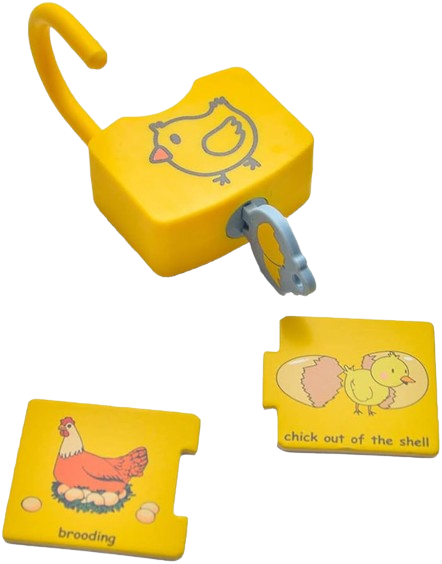 Setul de joaca faciliteaza invatarea si exersarea deprinderilor de a incuia sau descuia si de a asocia imagini.