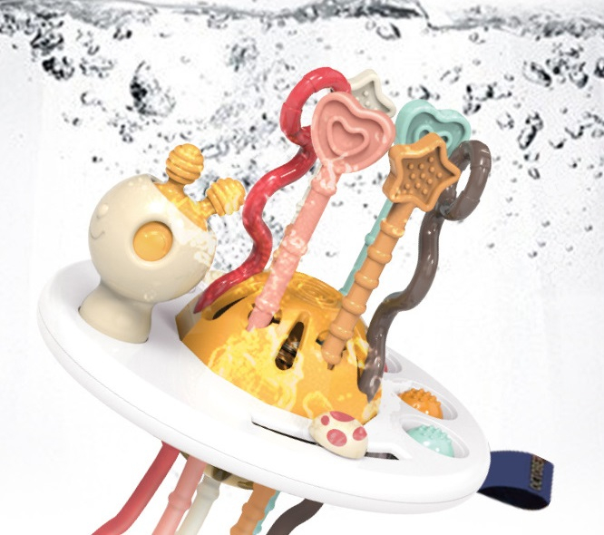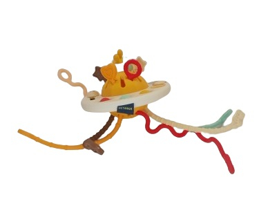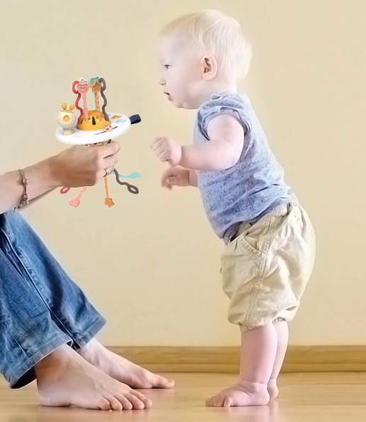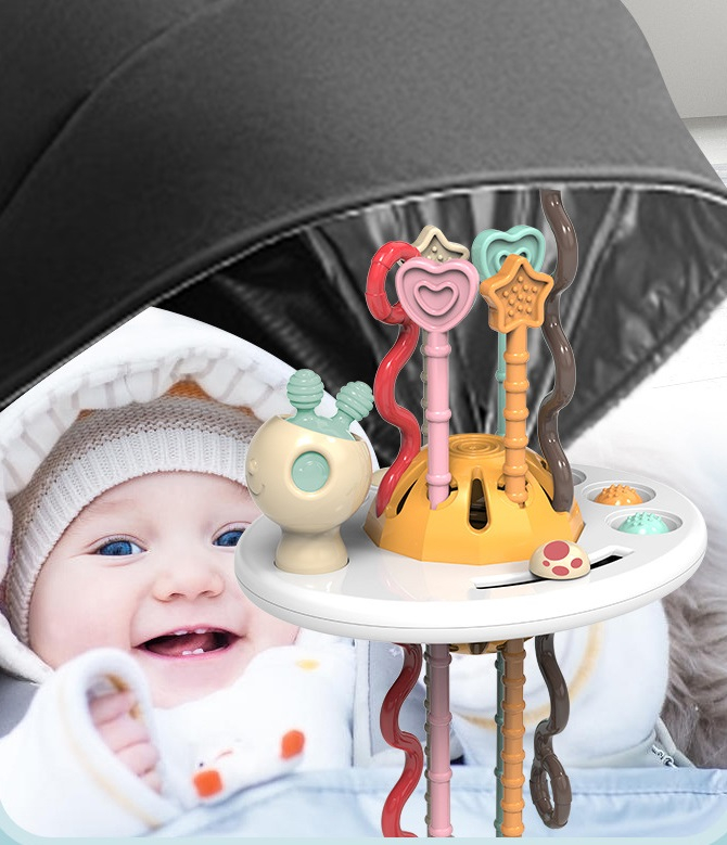 Bebelusii exploreaza aceasta jucarie senzoriala prin diferitele sunete si vibratii generate de tragerea in sus si in jos, apasarea, mestecarea, scuturarea, iar cordoanele moi, cu textura diferita, sunt mai usor de inteles de catre copil si promoveaza dezvoltarea simturilor bebelusului.
