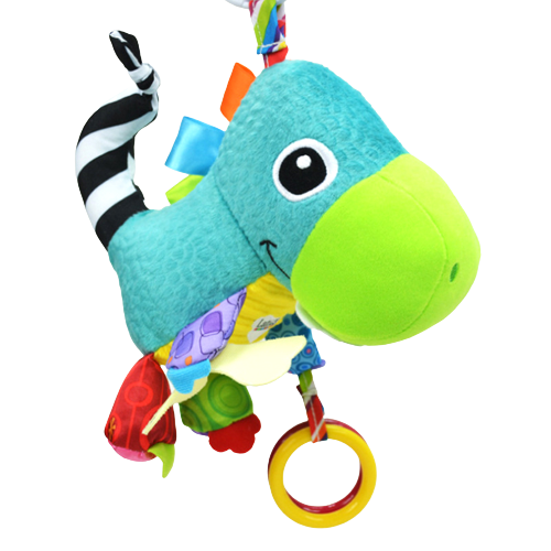 Zornaielile si chitaiturile jucariei dezvolta simtul auditiv iar coloritul viu al fibrelor stimuleza simtul tactil si cel vizual.