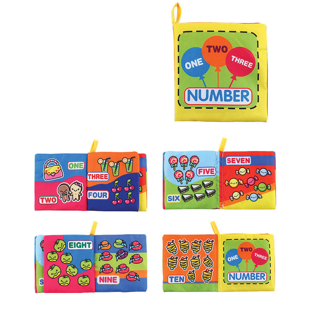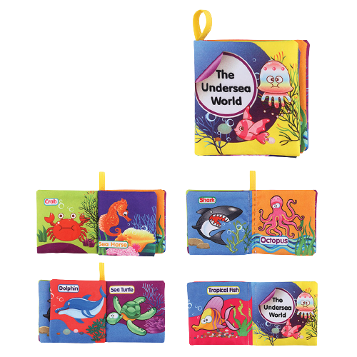Set 6 carti senzoriale fosnitoare pentru bebelusi, cu animalute dragute, culori, numere, vietati acvatice, 4 pagini, 8 fete, 10 cm x 2,5 cm x 9 cm