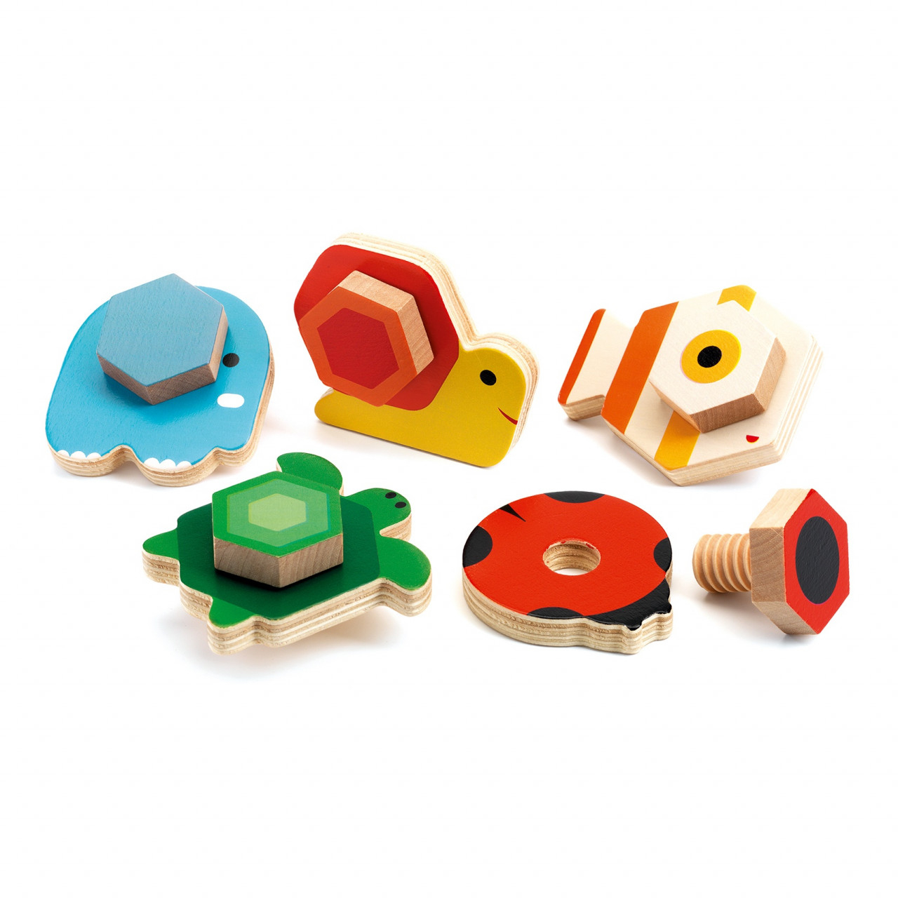 Animale cu surub TournaBasic Cinci animale din lemn în culori clasice, de înșurubat. Copiii aleg un animal și caută șurubul de aceeași culoare pentru a-l completa. Fiecare animal poate constitui o jucărie individuală, după ce copilul va reuși să înșurubeze piesele potrivite. Joc de îndemânare și de experimentare culori și modele. Conținut: 5 piese din lemn ilustrate și 5 șuruburi din lemn. Vârsta recomandată: + 18 luni Confecționat din lemn, cu vopsele non-toxice. Conform reglementărilor EN71 & ASTM. AVERTISMENT: Contraindicat copiilor mai mici de 2 ani, conţine piese mici, pericol de sufocare. A se folosi sub directa supraveghere a unei persoane adulte. Producător: Djeco, Franţa.
