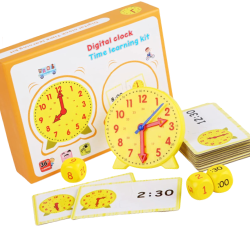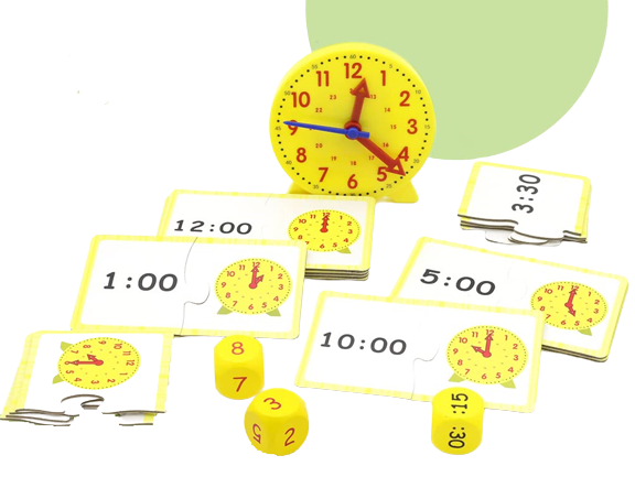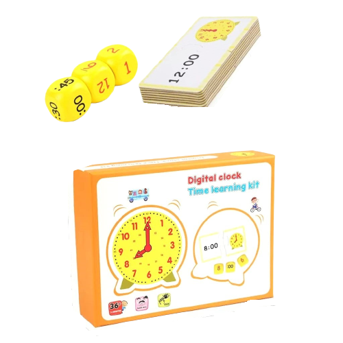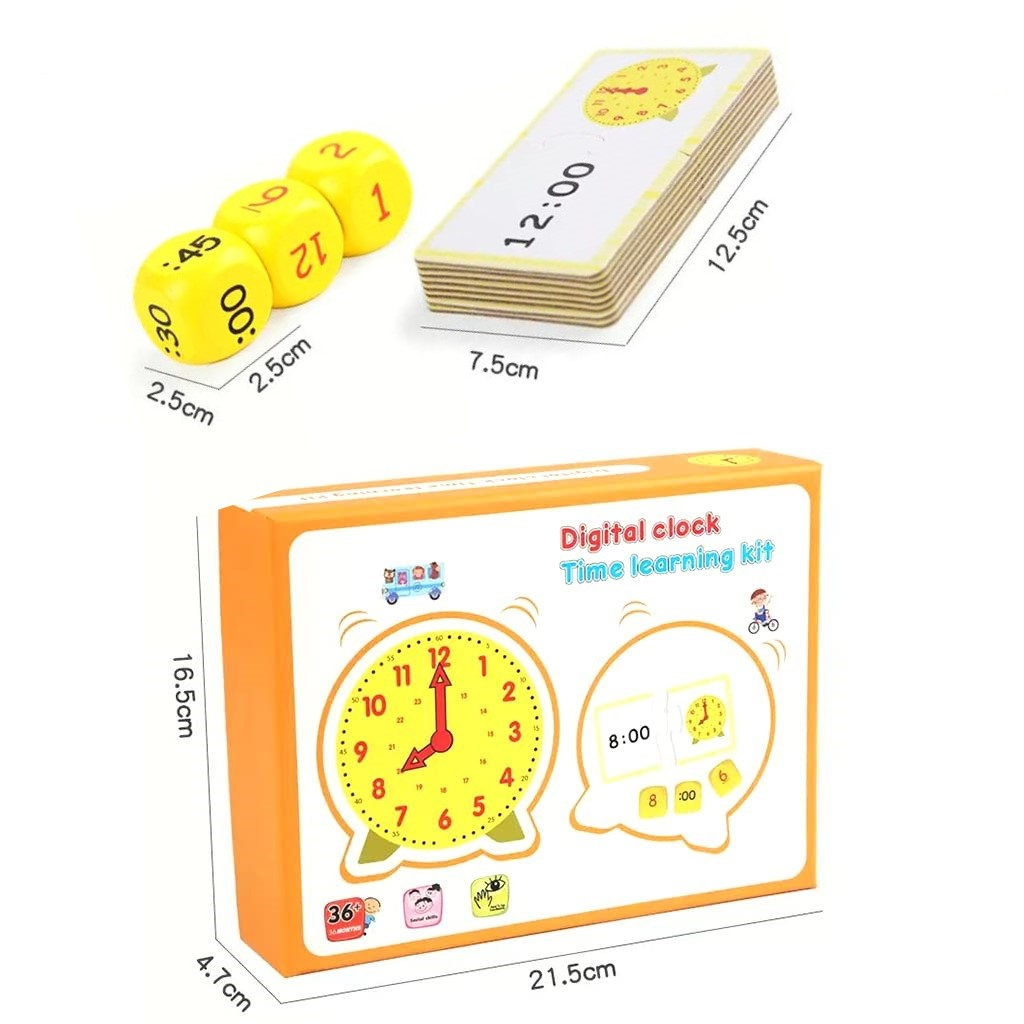 Acest set include un ceas de simulare cu oră mobila, minute, secunda, 12 carduri flash cu timp aleatoriu, model fata-verso pentru a vizualiza diferenta dintre ceasul digital si ceasul analogic, si 2 zaruri cu ora si minut.