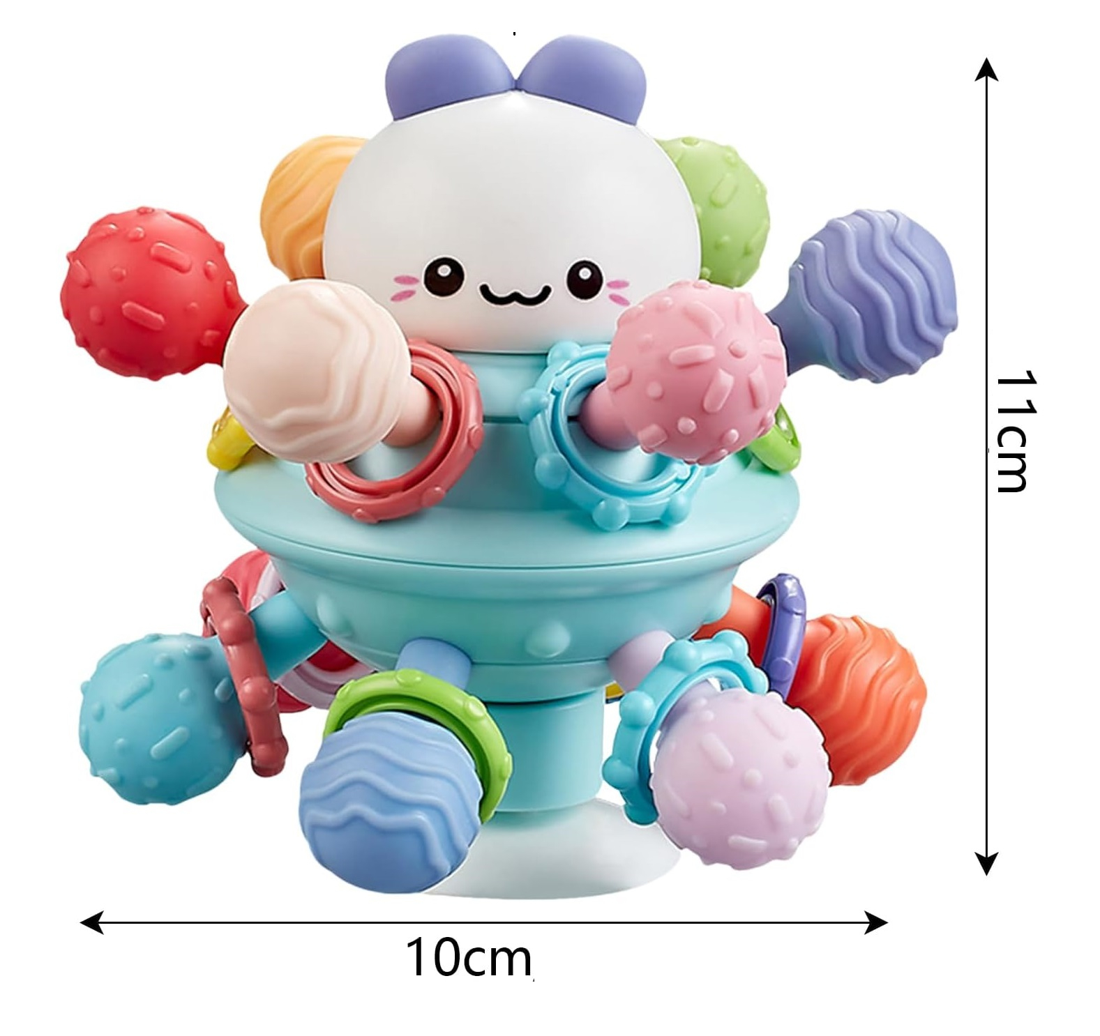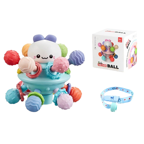 Jucaria este fabricata din silicon sigur si netoxic, fara BPA, maseaza gingiile bebelusului si calmeaza emotiile.