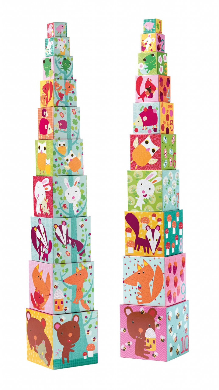Turn de construit Padure 10 blocuri din carton care pot fi clădite unul peste celălalt sau se pot așeza unul în altul. Fiecare piesă are 5 laturi cu imagini și tematici diferite. Copiii stivuiesc cuburile astfel încât ilustrațiile să creeze o secvență logică. Se pot învăța forme, culori, animale, cifre. Ajută copilul să aproximeze mărimile şi să își dezvolte abilităţile motorice. Vârsta recomandată: +1 an. Confecționat din carton non-toxic, conform reglementărilor EN71&ASTM. AVERTISMENT: Se recomandă supravegherea cu atenție a copilului în timpul jocului de către un adult. Producător: Djeco, Franța