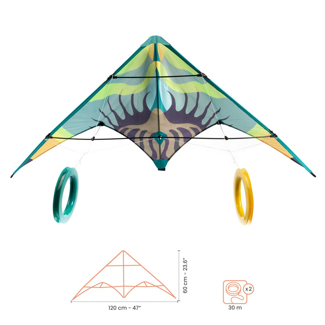 Zmeu acrobatic Valuri Zmeu de acrobație cu dublă mânuire. Zmeu acrobatic pop-up: ușor de asamblat și demontat, cu husă pentru depozitare. Este inclus un ghid de utilizare ilustrat cu diagrame pentru a învăța acrobațiile și a descoperi zborul. Materiale rezistente și durabile. Conținut: zmeu pânză (H. 60 x L. 120 cm), 2 sfori de 30 m, 2 mânere, cadru din fibră de sticlă și husă pentru depozitare. Recomandat pentru vârste începând cu 8 ani, cu supravegherea unui adult. Confecționat din material textil și plastic, conform reglementărilor EN71 & ASTM. AVERTISMENT: Contraindicat copiilor sub 3 ani. A se utiliza strict sub supravegherea unei persoane adulte. Conține fir lung, pericol de ștrangulare. Producător: Djeco, Franța
