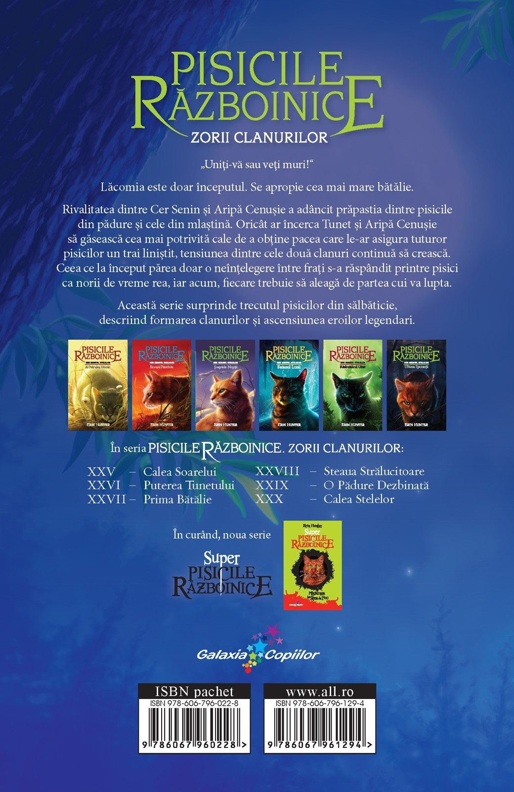 Cititorii români au parcurs până acum întâmplările captivante de pe tărâmul pisicesc, așa cum au fost ele descrise în patru serii a câte șase volume – prima serie, „Noua profeție”, „Puterea celor trei” și „Sub semnul stelelor”. „Zorii clanurilor”, a cincea serie din povestea pisicilor războinice, surprinde fantasticele aventuri din trecutul personajelor, descriind formarea clanurilor și ascensiunea eroilor legendari.