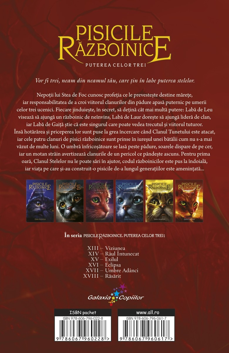 Șase scriitoare reunite sub pseudonimul Erin Hunter și inspirate de personalitatea fascinantă a pisicilor au dat naștere unui adevărat fenomen literar internațional. Pisicile războinice au ajuns deja la al 37-lea volum și au fost traduse în peste 20 de țări. Cartea a XVI-a – Eclipsa –, al patrulea volum din cea de-a treia serie, Puterea celor trei, le aduce cititorilor din România vești prețioase despre nepoții lui Stea de Foc.