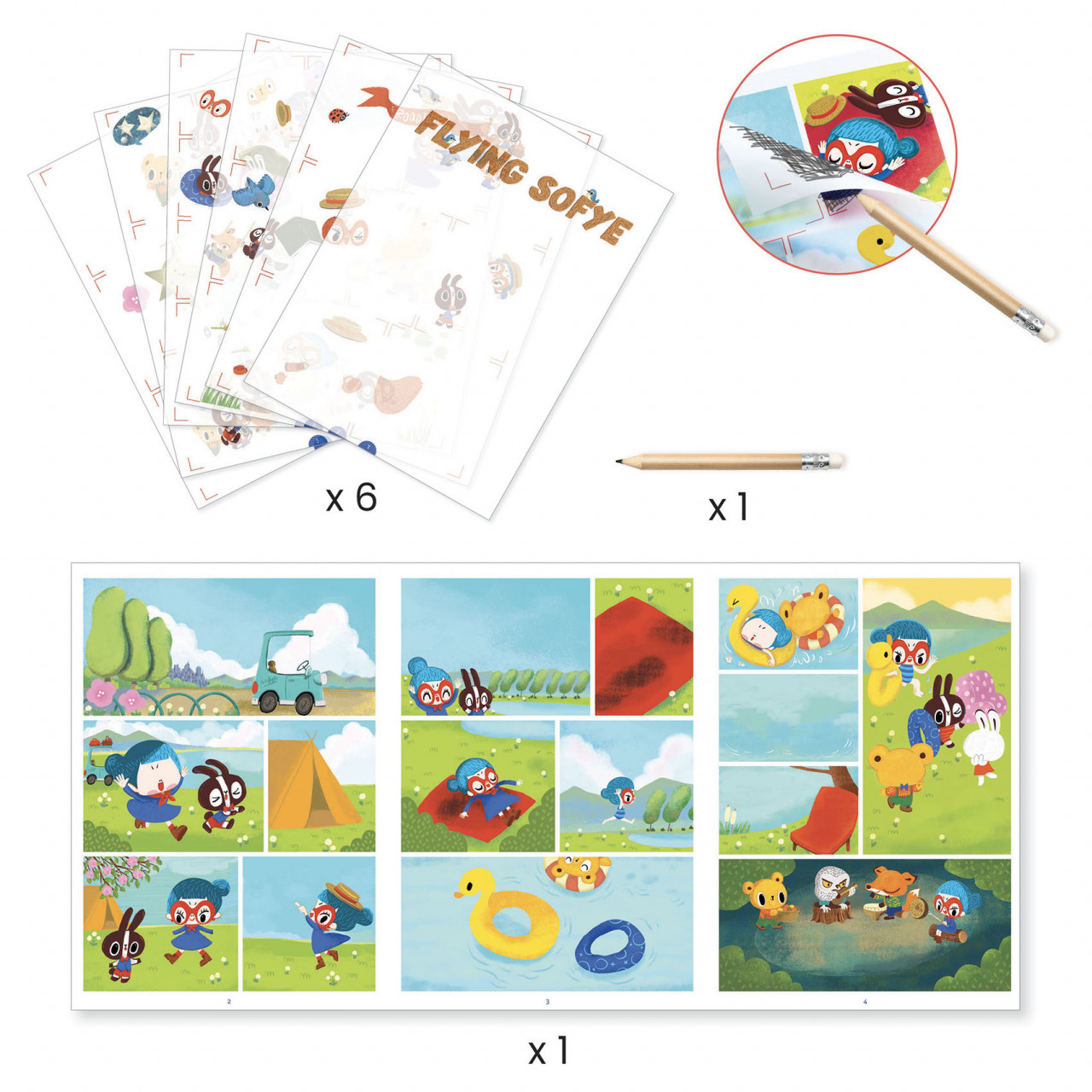 Set creativ de animație Sofie Joc clasic reinventat de Djeco sub forma îndrăgitelor benzi de desene animate. Acest set îi invită pe copii să creeze o bandă desenată cu personaje amuzante folosind planșele de transfer: imaginile se răzuiesc ușor cu creionul și se transferă pe planșa fundal preilustrată. Pas cu pas, copiii poziționează elementele pe fundal pentru a completa povestea pe măsură ce povestea prinde contur în fața lor. Conține: planșă fundal ilustrată (45 x 21,5 cm), 6 coli cu imaginile de răzuit (aprox. 100 buc), creion, broșură în imagini cu etapele de lucru. Vârsta recomandată: 5-8 ani. Fabricat din hârtie și carton certificate FSC®. AVERTISMENT: Contraindicat copiilor sub 3 ani, conține piese mici, pericol de sufocare. A se folosi sub directa supraveghere a unei persoane adulte. Producător: Djeco, Franța .