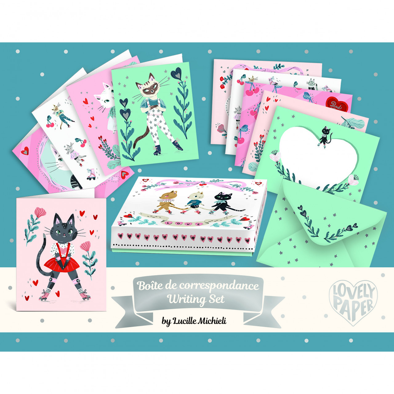 O cutie mică de corespondență cu ilustrații drăguțe și finisaje aurii care conține 10 felicitări și 10 plicuri cu pisici cu personalitate. Cutia perfectă pentru corespondența cu prietenii sau familia. Lovely Paper de la Djeco este o colecție de articole de papetărie rafinate și delicate, cu ilustrații frumoase pentru a înveseli viața de zi cu zi a copiilor și adulților. Conținut: cutie de carton ilustrată cu 10 felicitări (2 x 5 stiluri, dimensiune 9 x 11 cm) + 10 plicuri (2 x 5 stiluri, dimensiune 11,5 x 9,2 cm). Confecționate din hârtie și carton certificate FSC®. Producător: Djeco, Franța